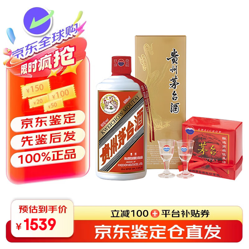 茅台(MOUTAI)贵州茅台酒 茅台飞天酒 飞天茅台 酱香型白酒 婚庆喜酒送礼 43度 500mL 1瓶 (带杯)